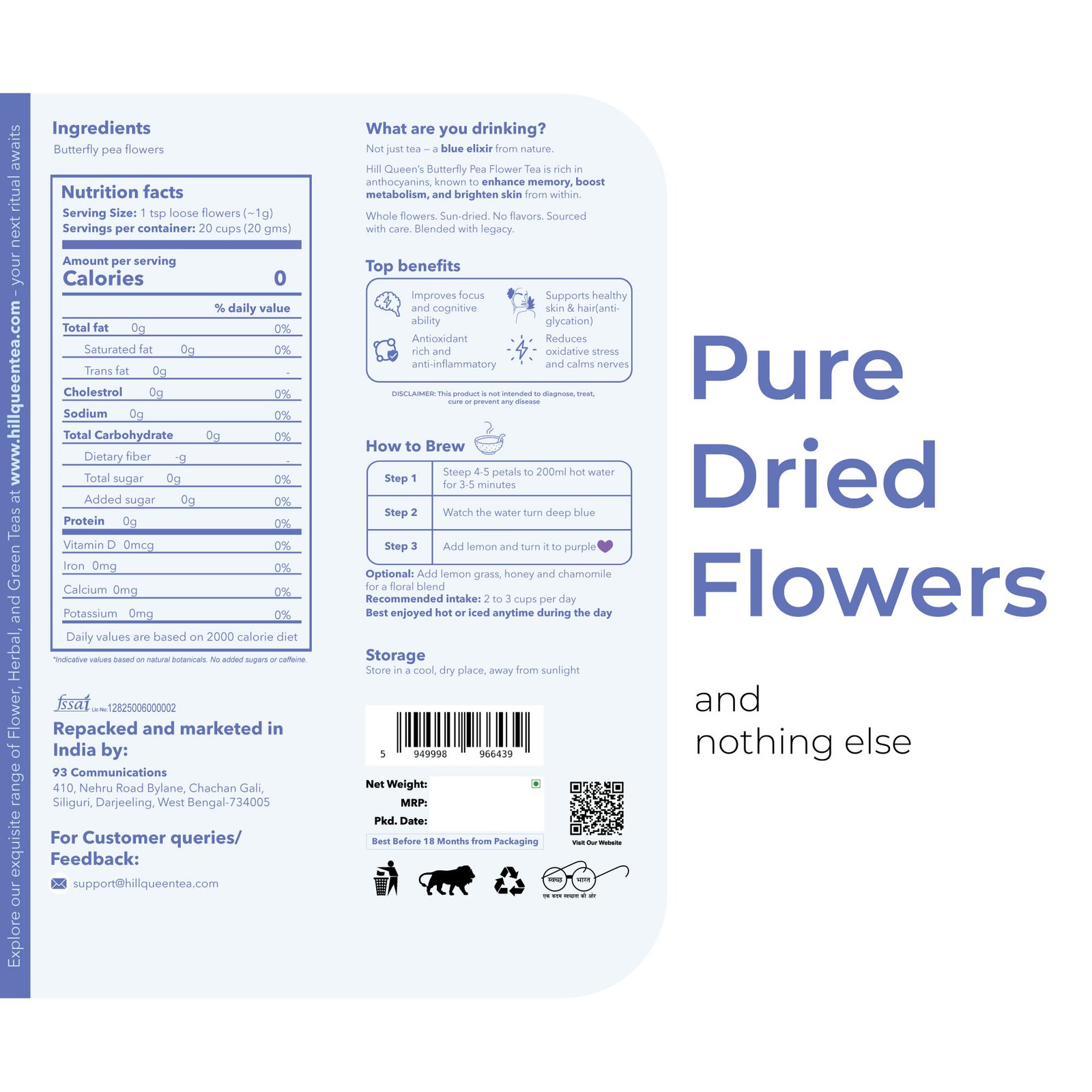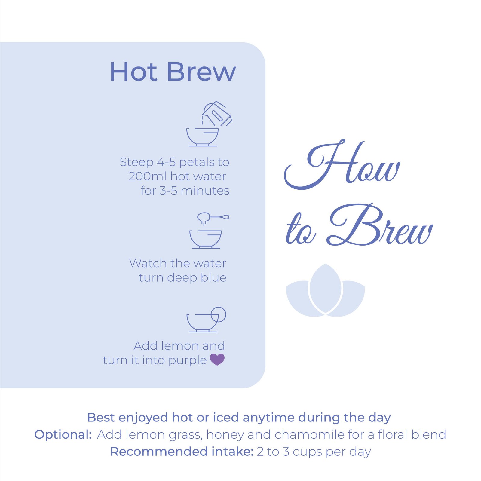 Add 1 tsp of flowers. Steep 4–5 minutes. Watch the blue bloom.